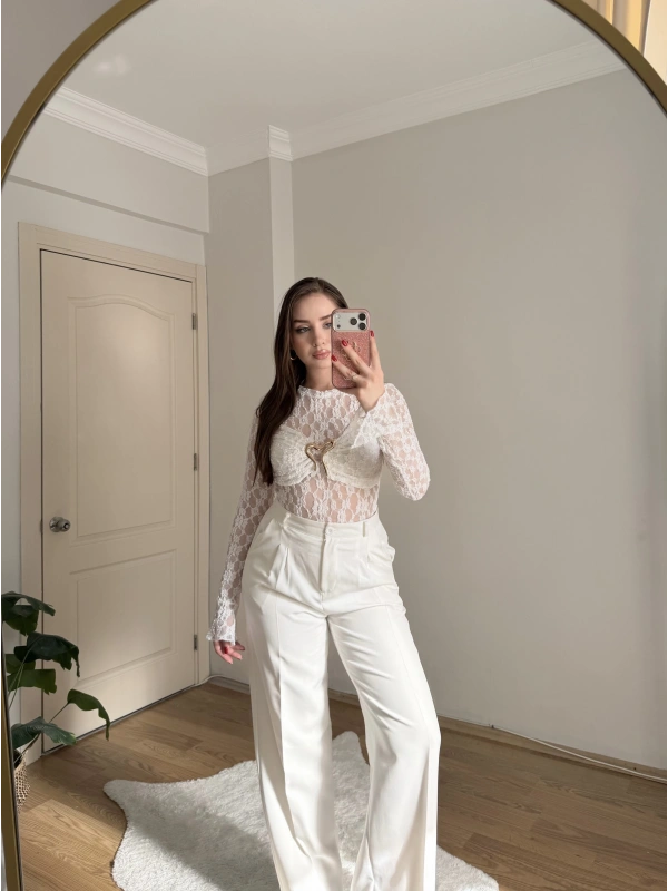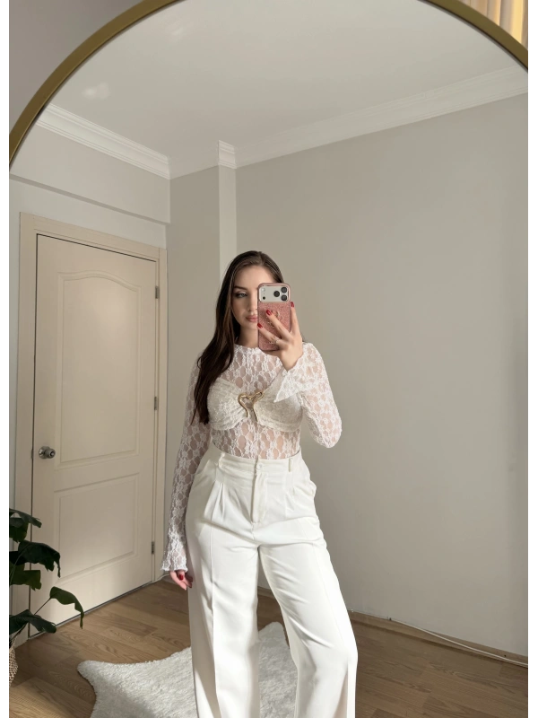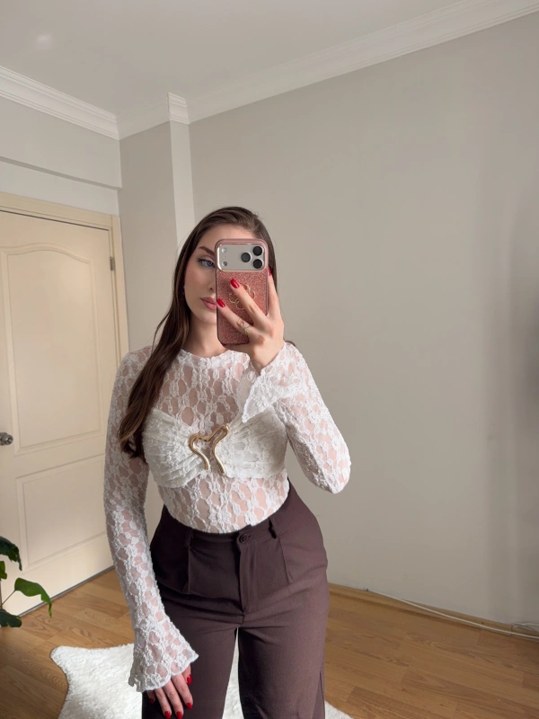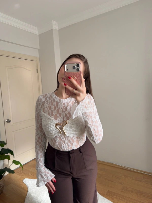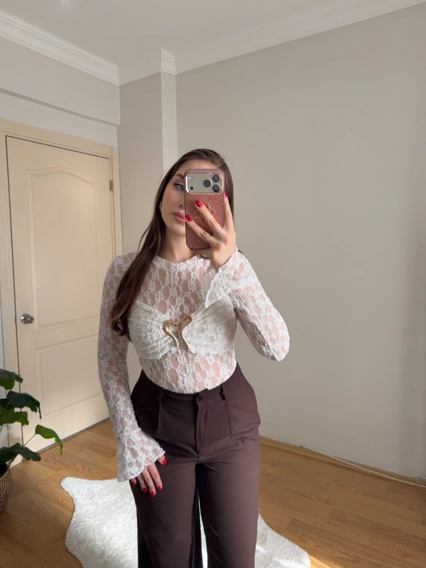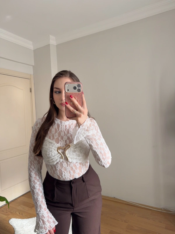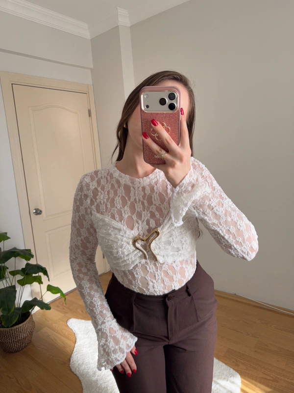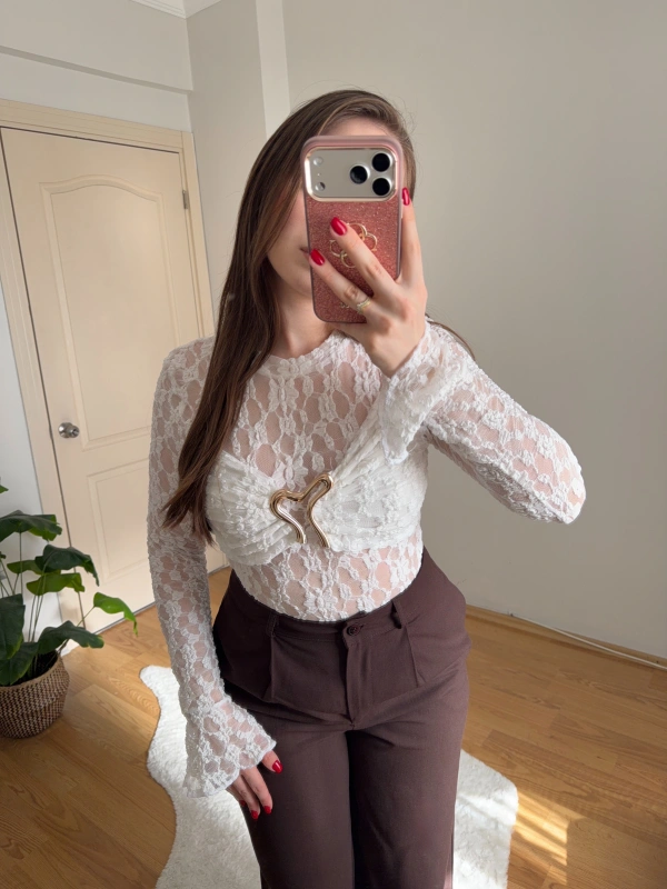 Gold Aksesuarlı Beyaz Dantel Body