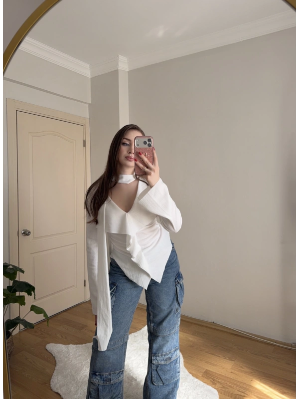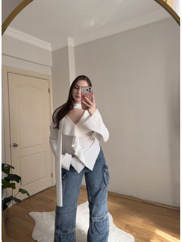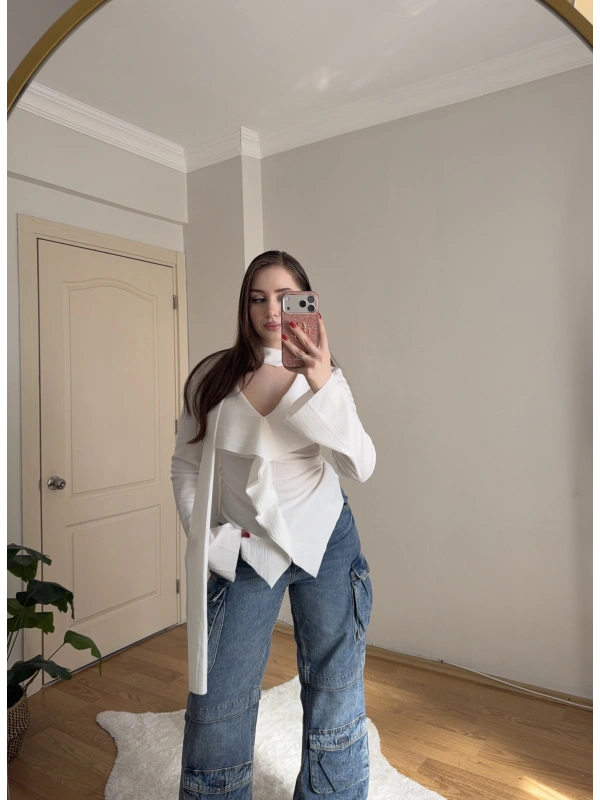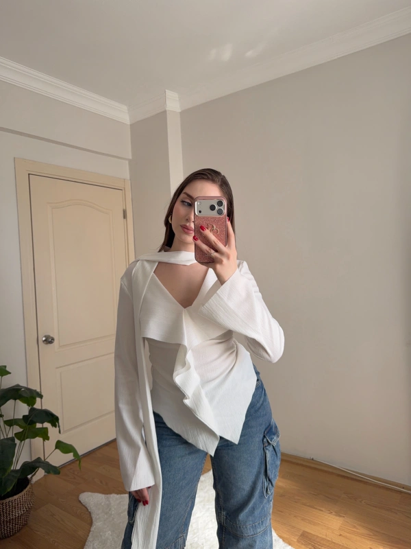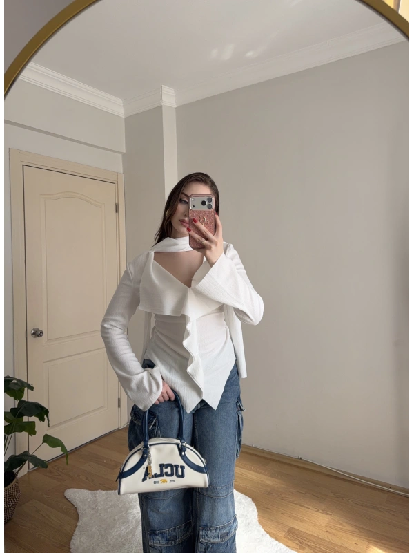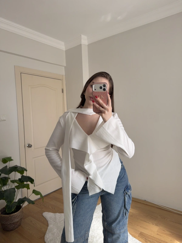 Yakası Bağlama Detaylı Dokulu Beyaz Bluz