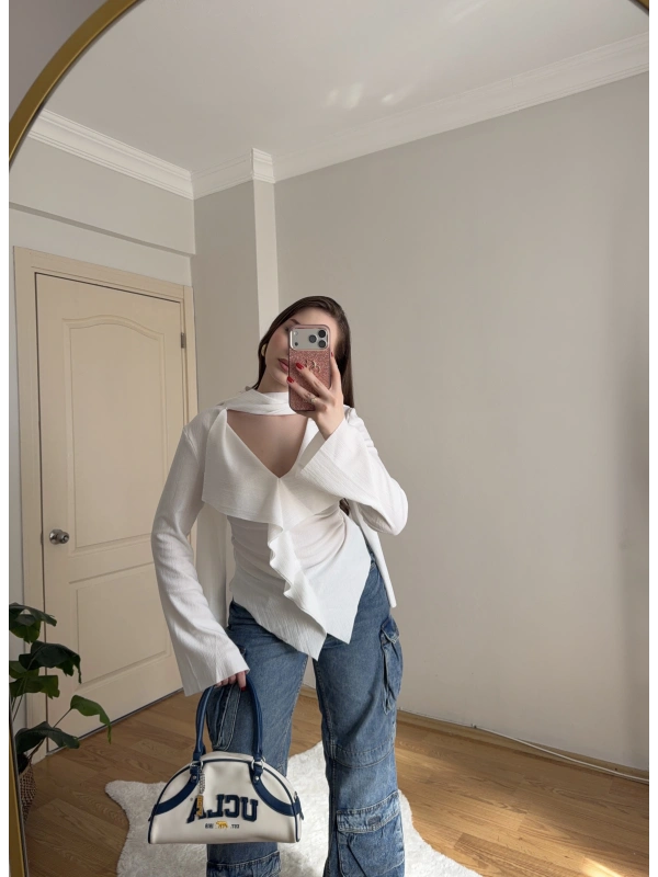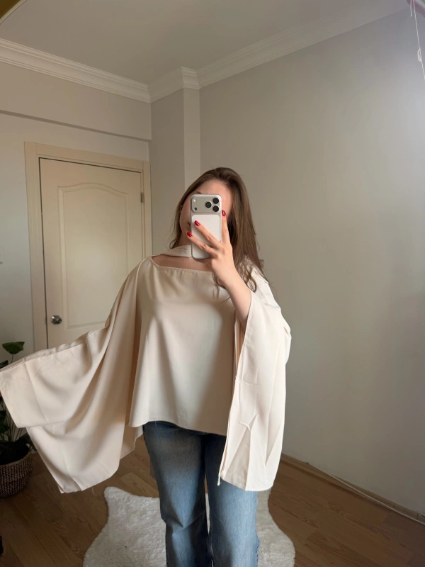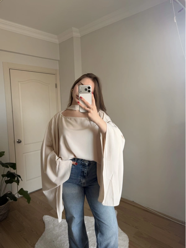 Fularlı Krem Pelerin Bluz