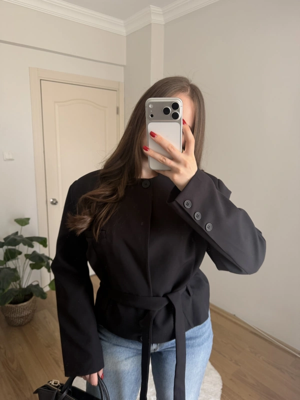 Vatkalı Dik Yaka Kuşaklı Siyah Ceket