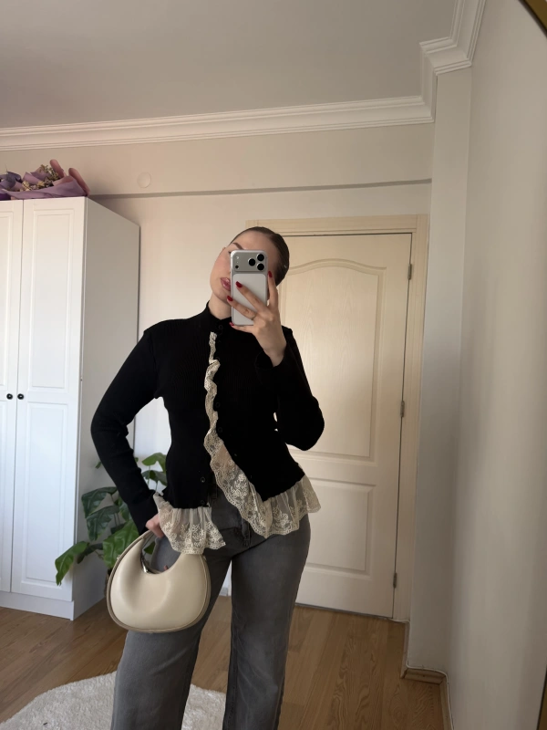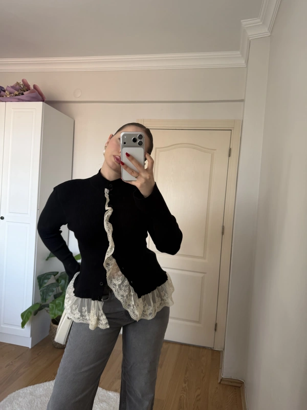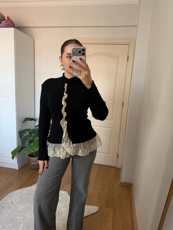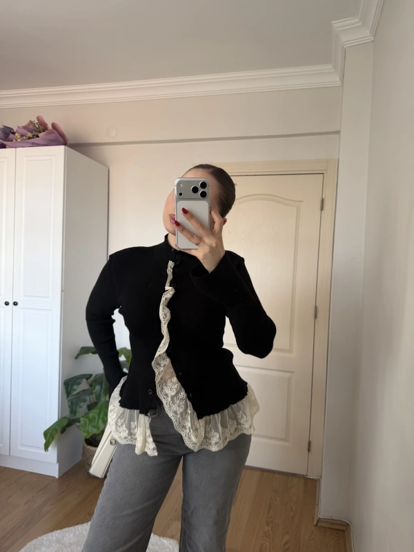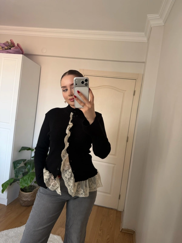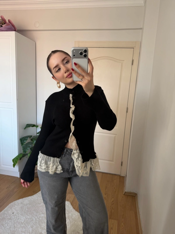 Dantel Detaylı Siyah Hırka