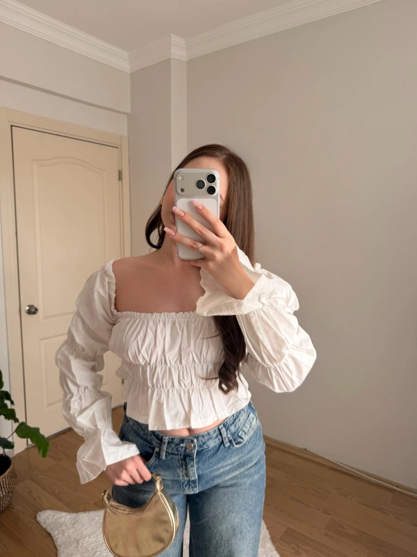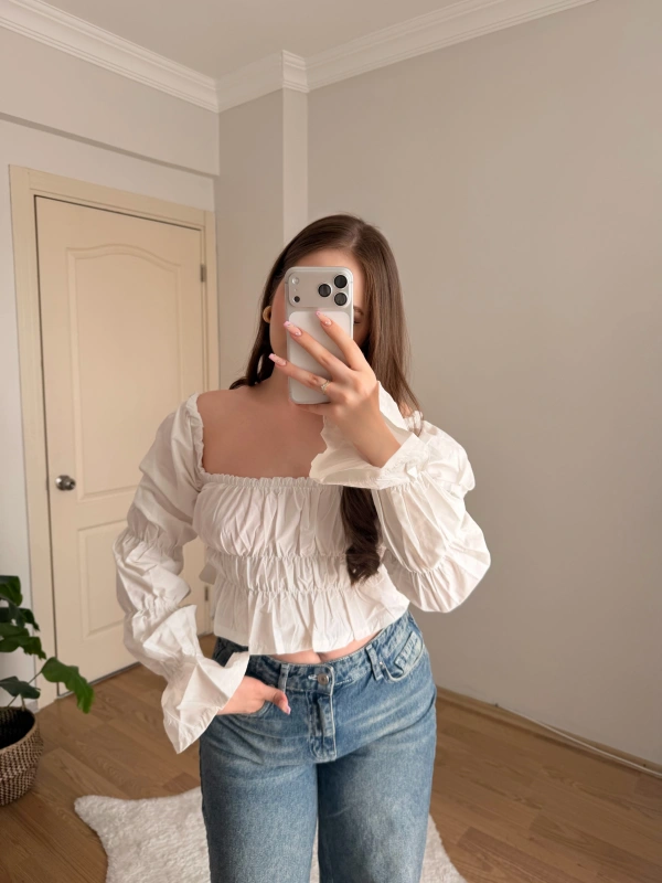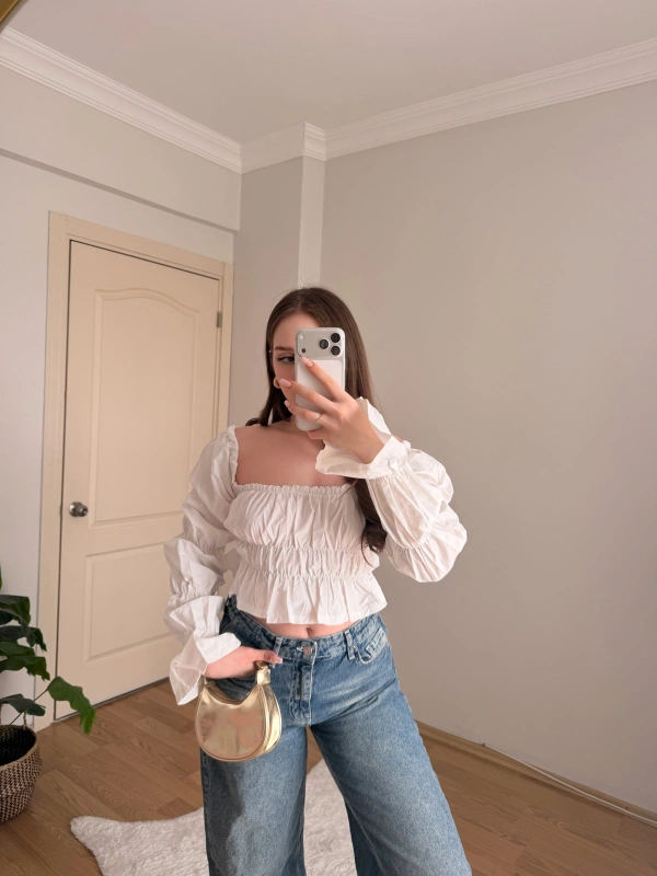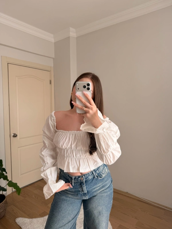 Balon Kol Omzu Açık Beyaz Crop Bluz