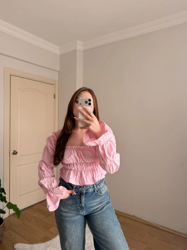 Balon Kol Omzu Açık Pembe Crop Bluz