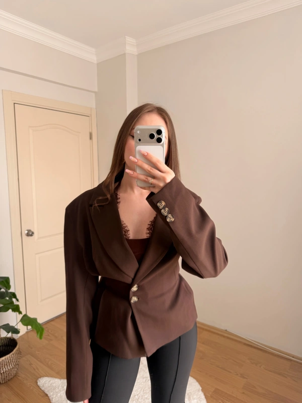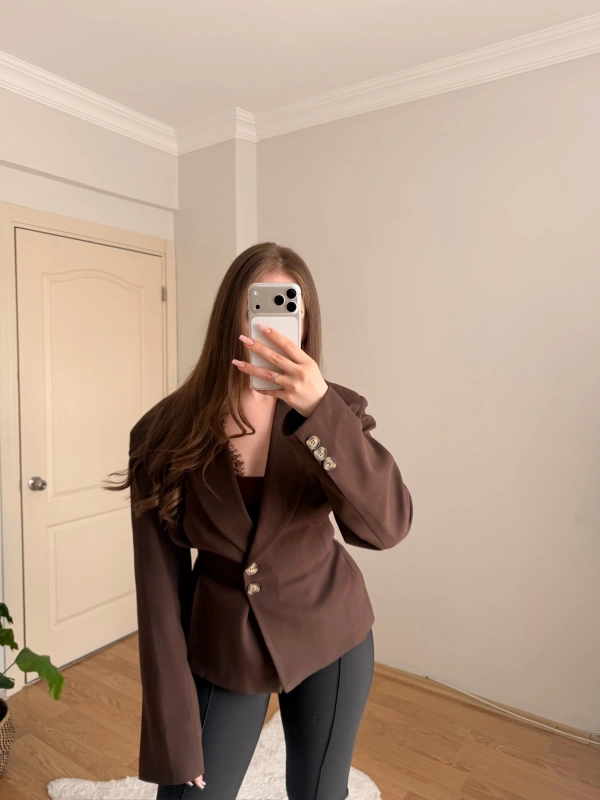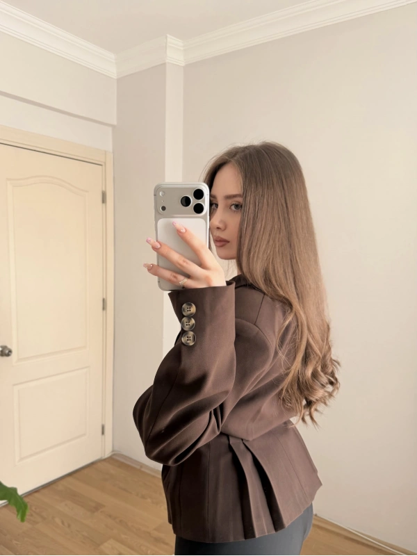Pileli Belden Oturtmalı Kahve Blazer Ceket