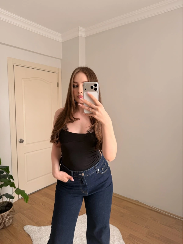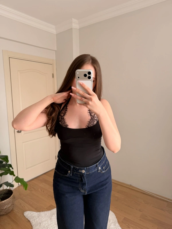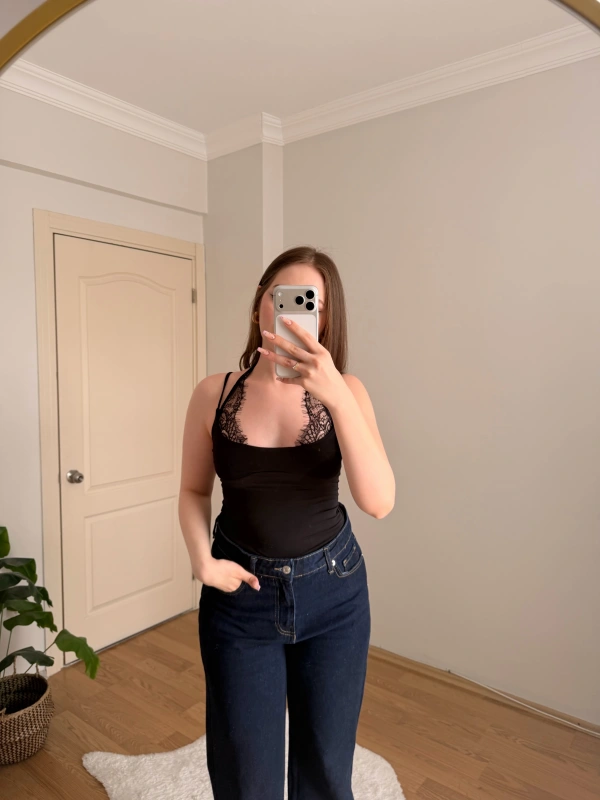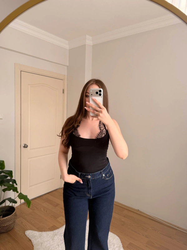 Dantel Detaylı Askılı Siyah Body