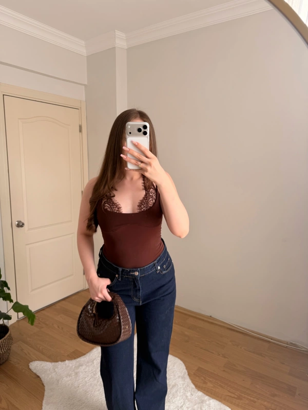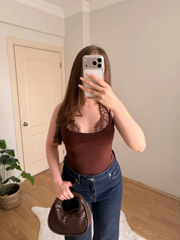 Dantel Detaylı Askılı Kahve Body
