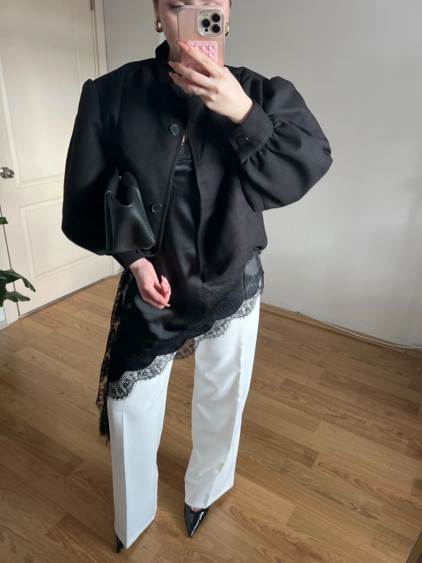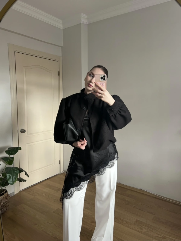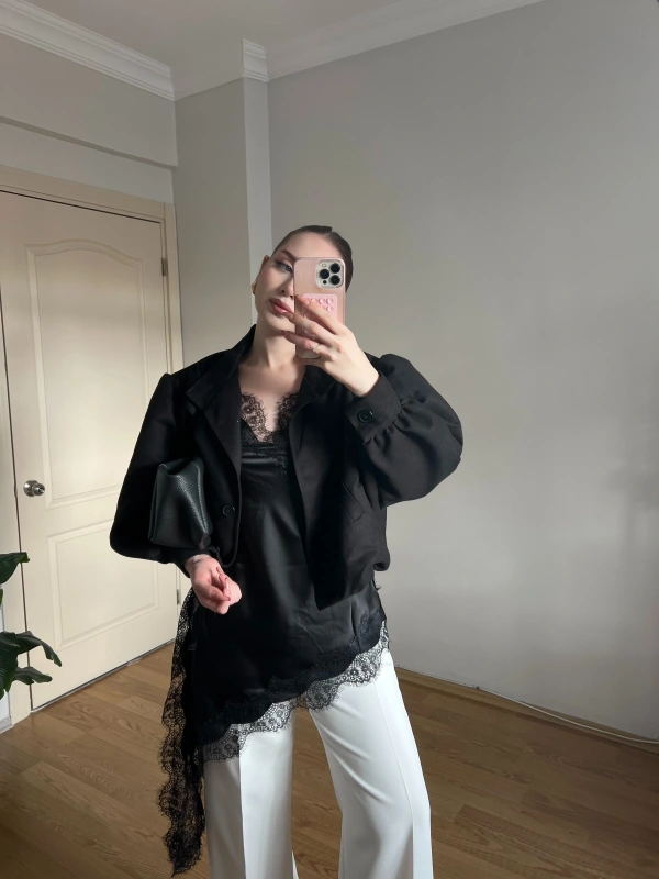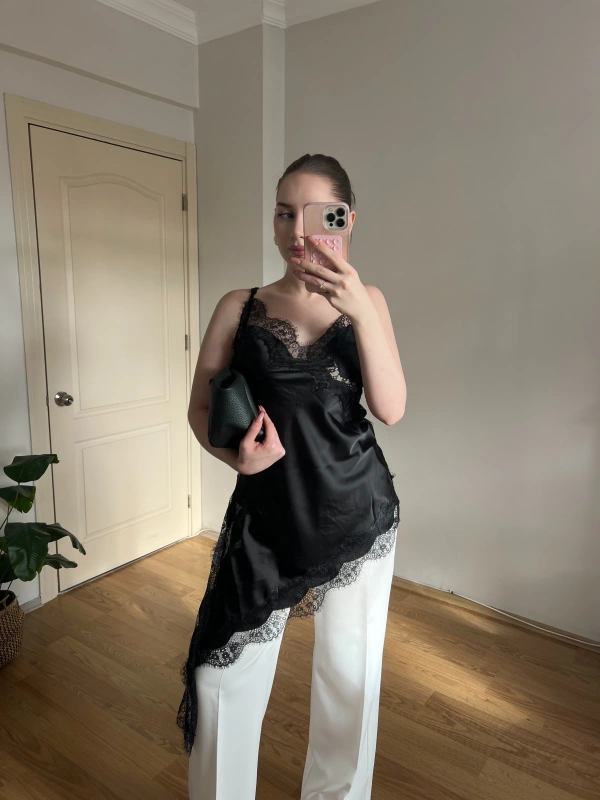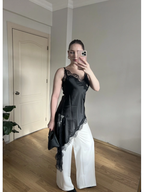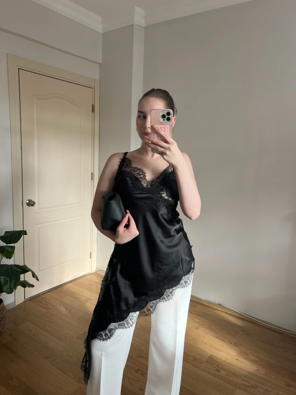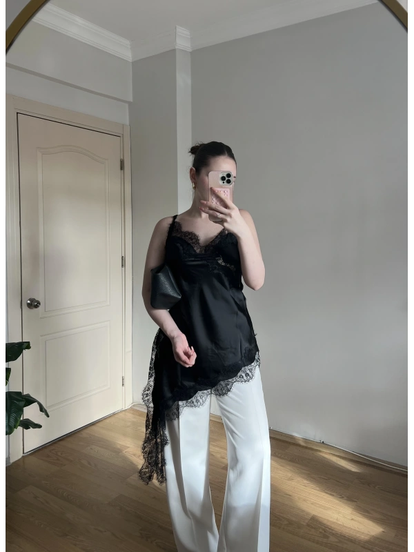 Asklılı Dantel Detaylı Siyah Saten Bluz