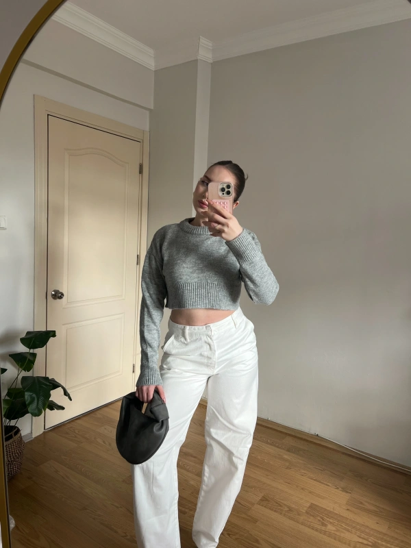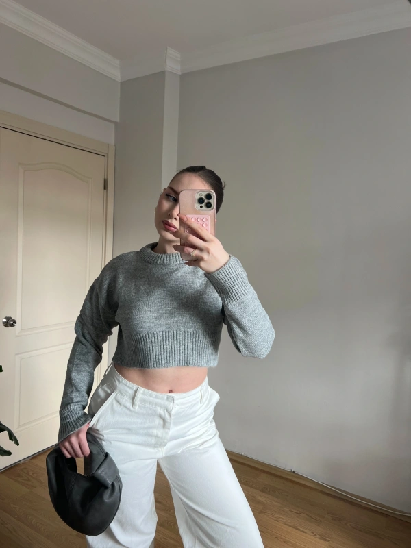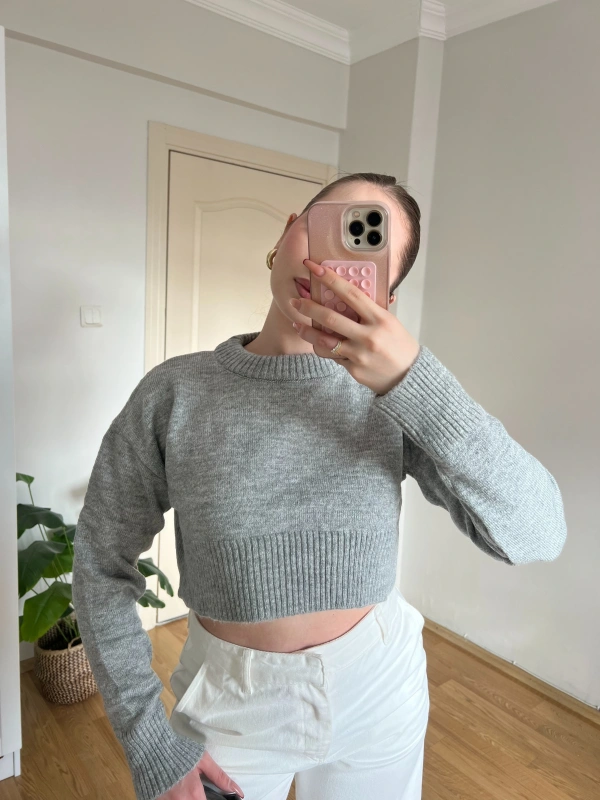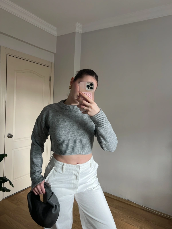 Bisiklet Yaka Gri Crop Kazak