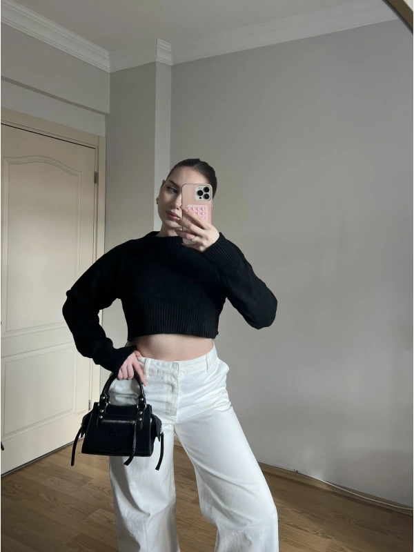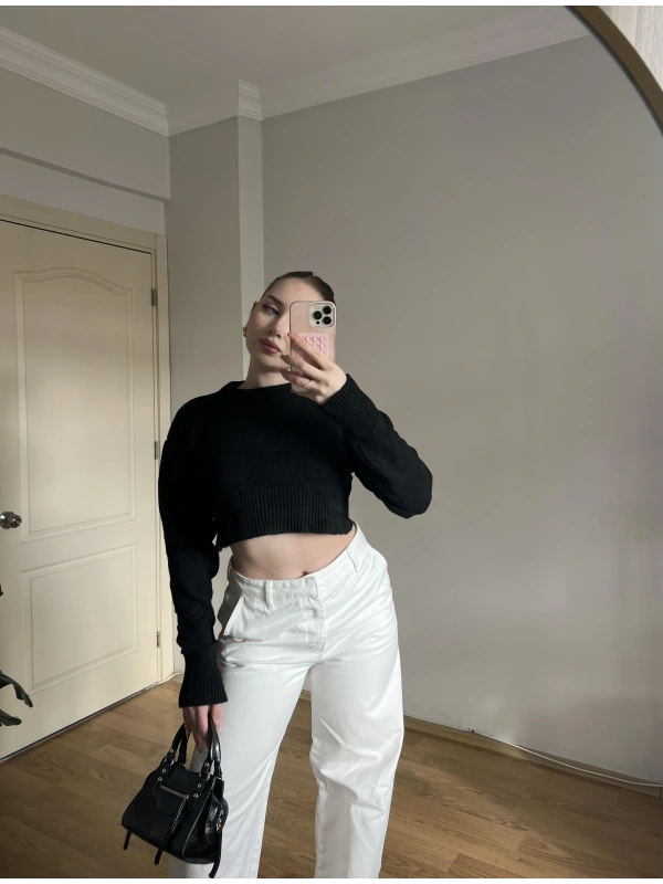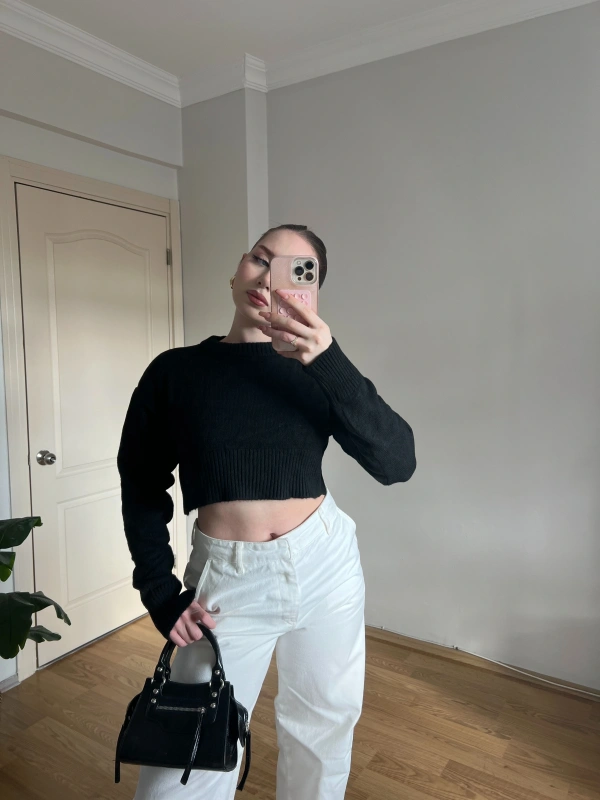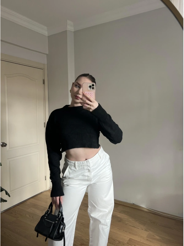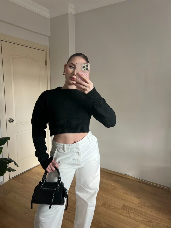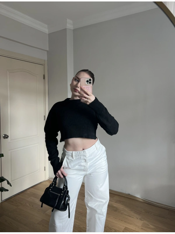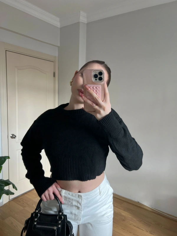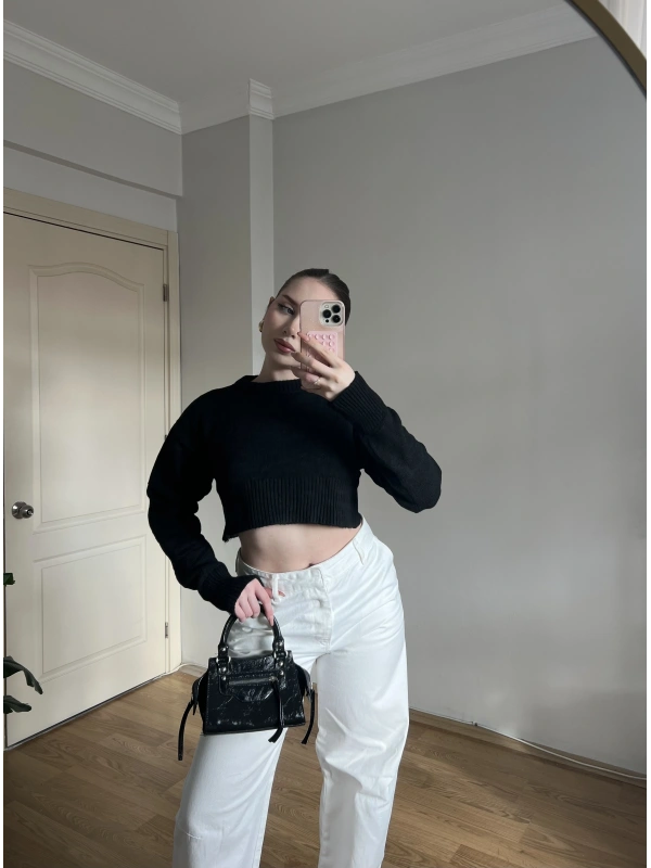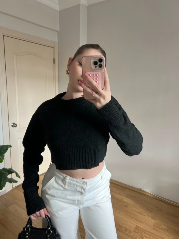 Bisiklet Yaka Siyah Crop Kazak