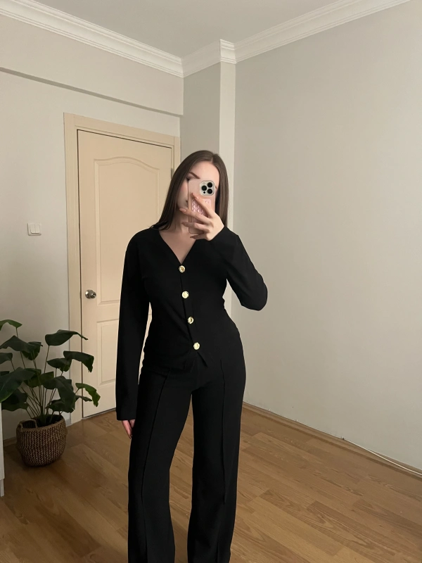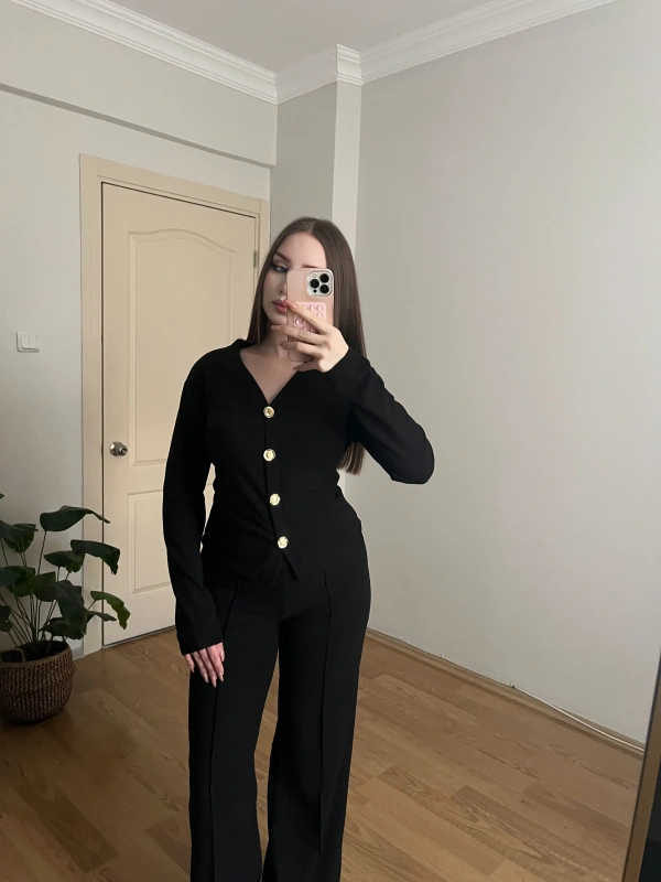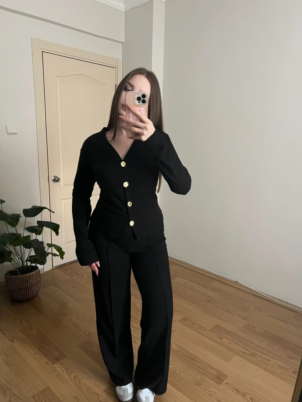 Gold Düğme Detaylı Siyah Pantolon Takım