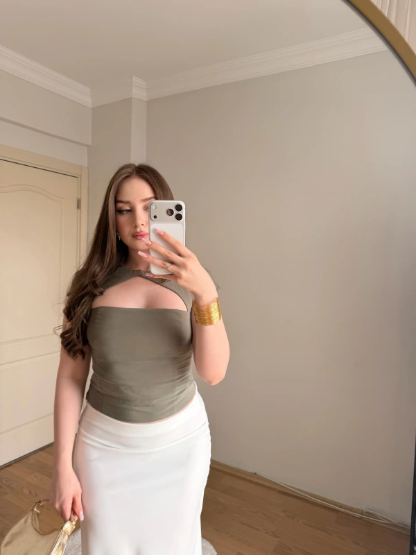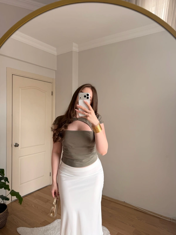 Büzgülü Yırtmaç Detaylı Beyaz Tişört