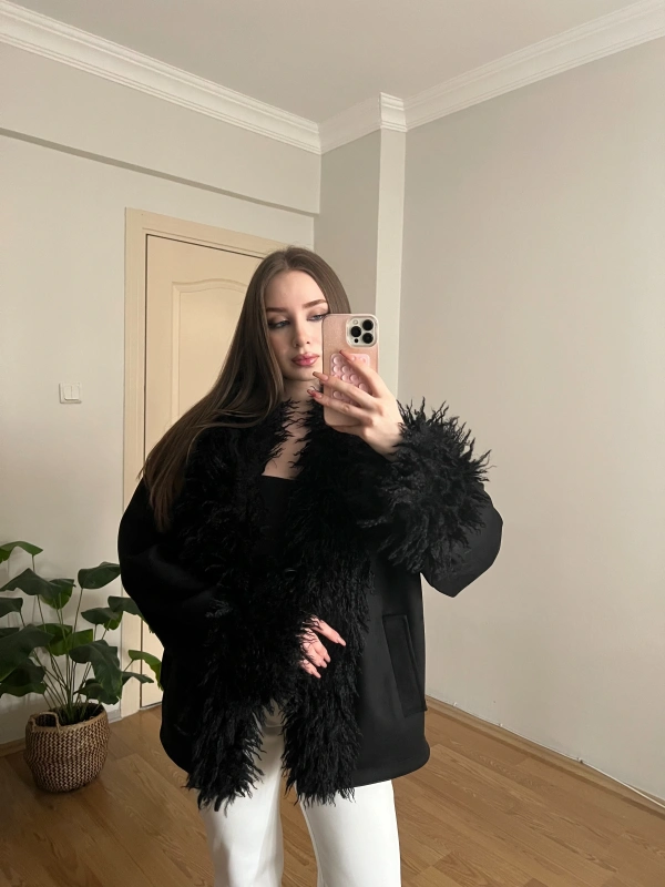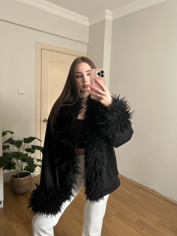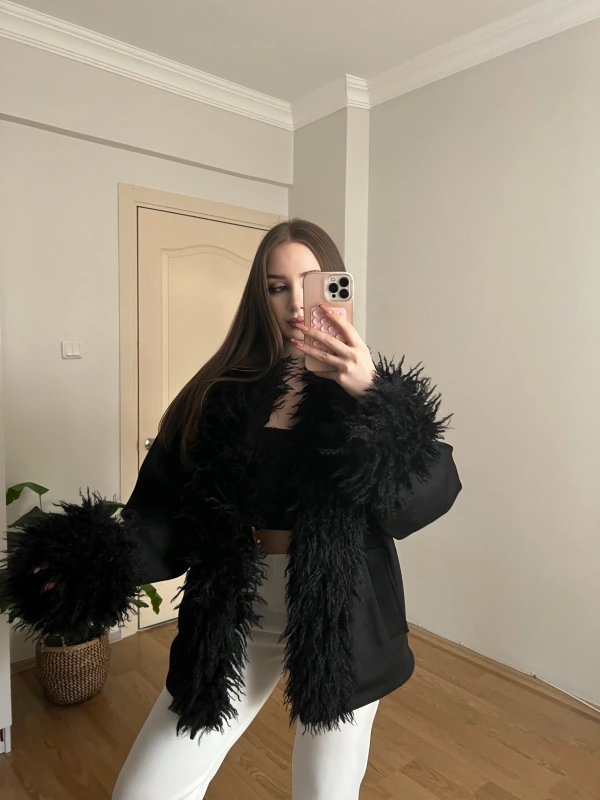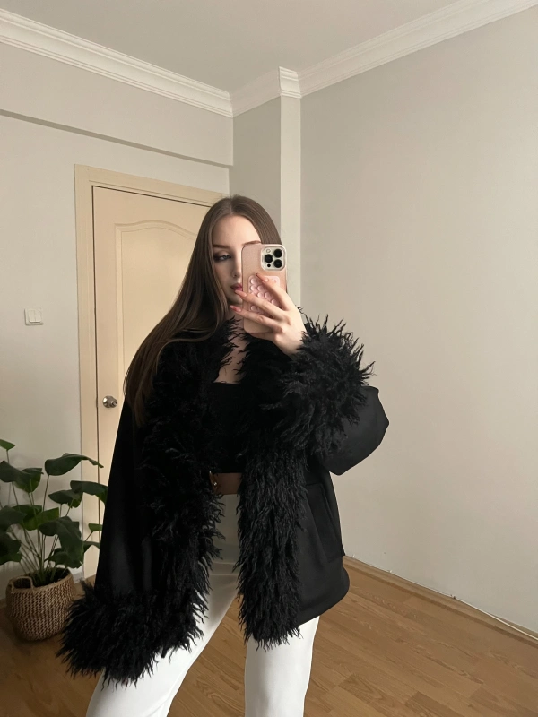 Kürk Detaylı Siyah Süet Ceket