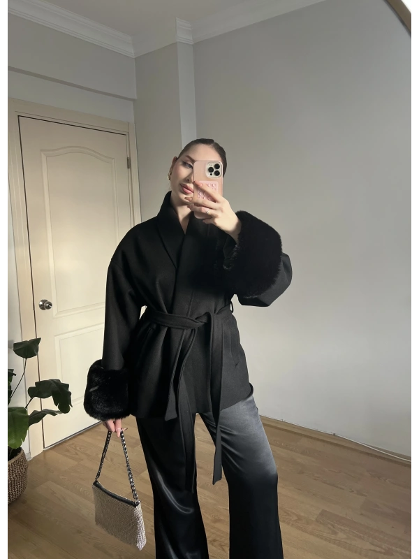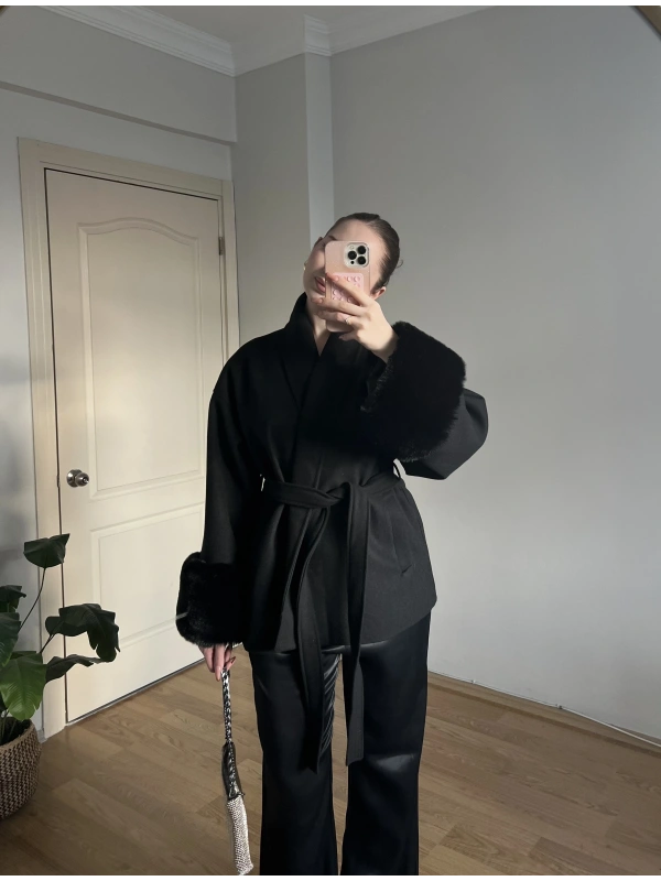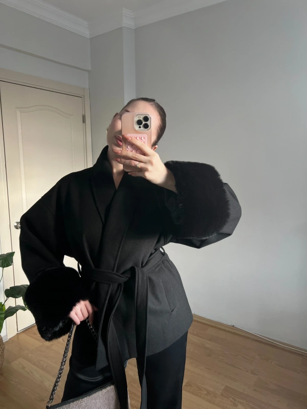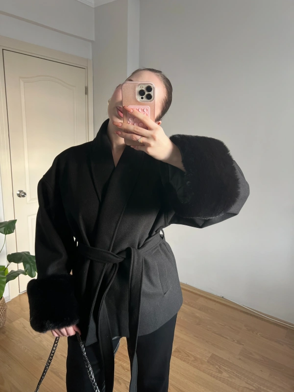 Kuşaklı Kolları Kürklü Siyah Kaşe Kaban