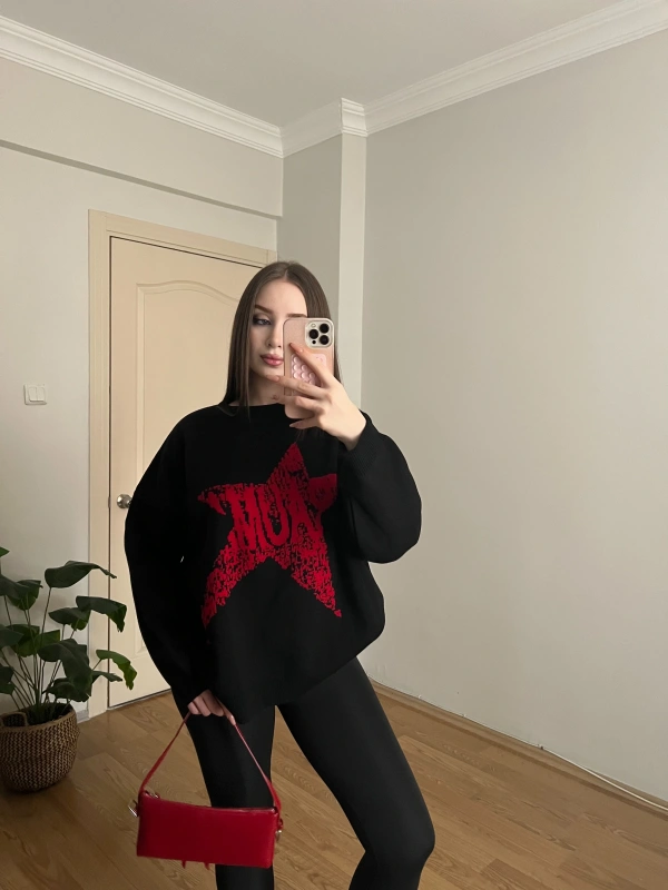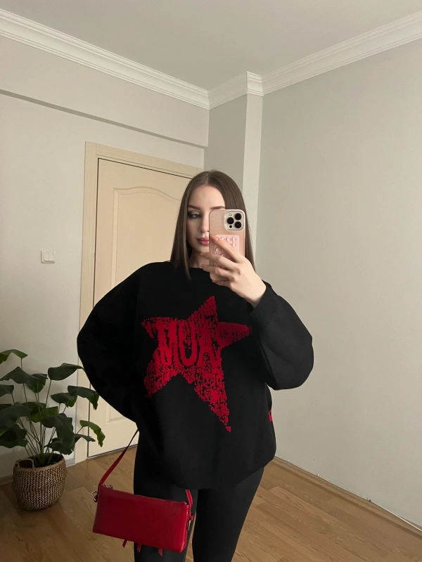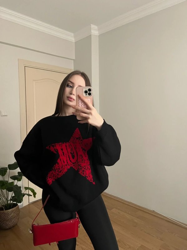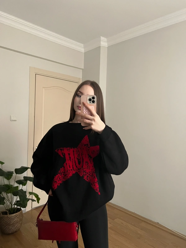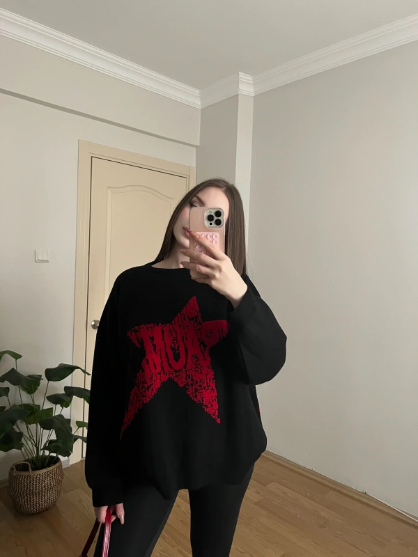 Yıdız Desenli Siyah Oversize Kazak