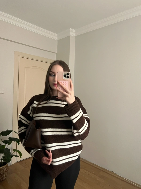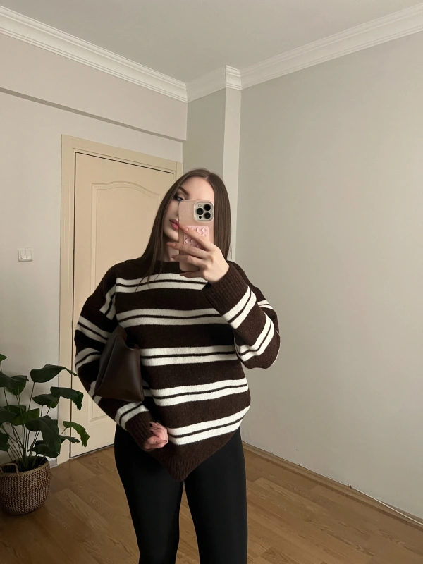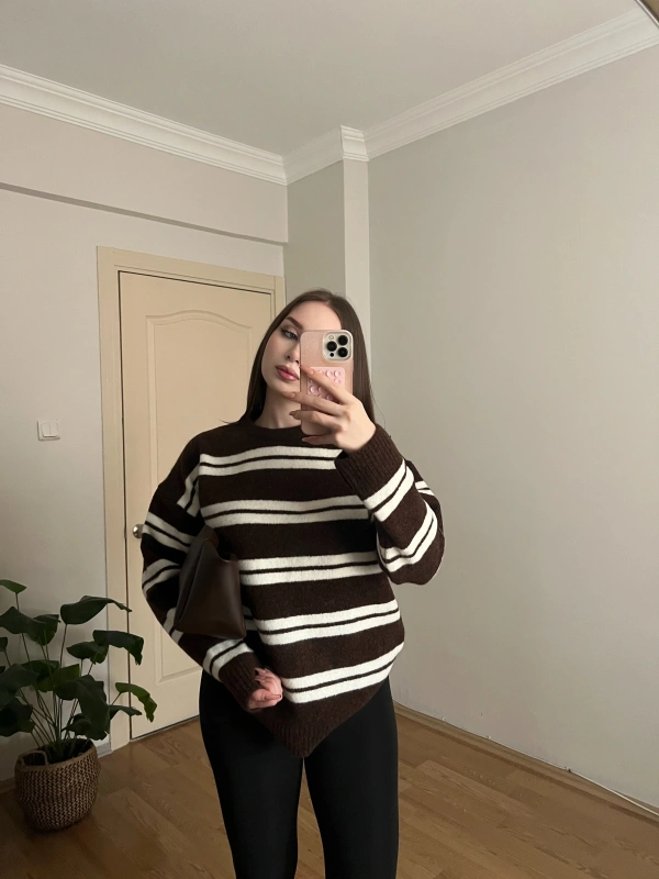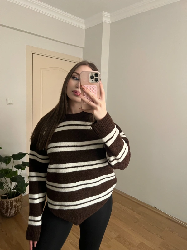 Yumuşak Dokulu Çizgili Kahverengi Kazak