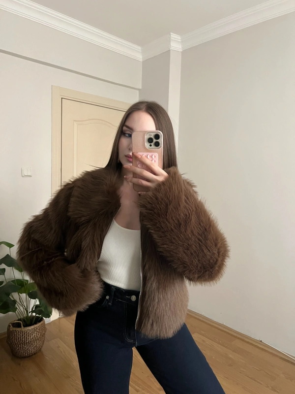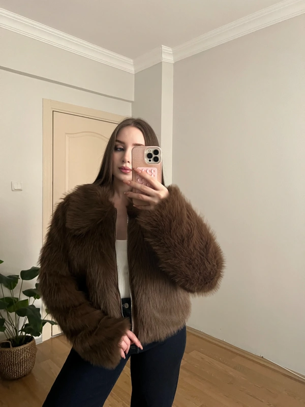 Fermuarlı Premium Kahverengi Kürk Ceket